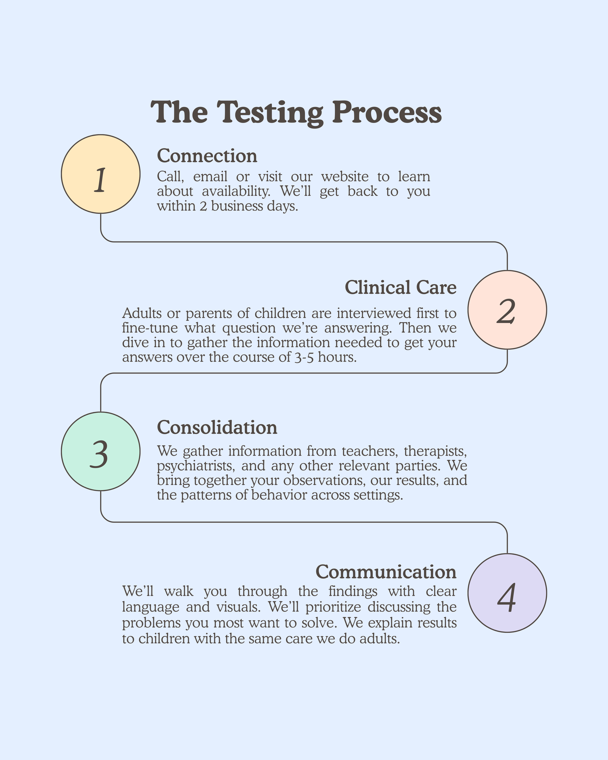 ADHD testing can best answer whether difficulties paying attention, controlling impulses, keeping pace, and staying organized are caused by a diagnosis of ADHD. Reports include diagnosis, recommendations for treatment, systems to apply at home, and recommended accommodations for school and work. Every adult or child tested will meet with the psychologist for about one hour to discuss the findings.